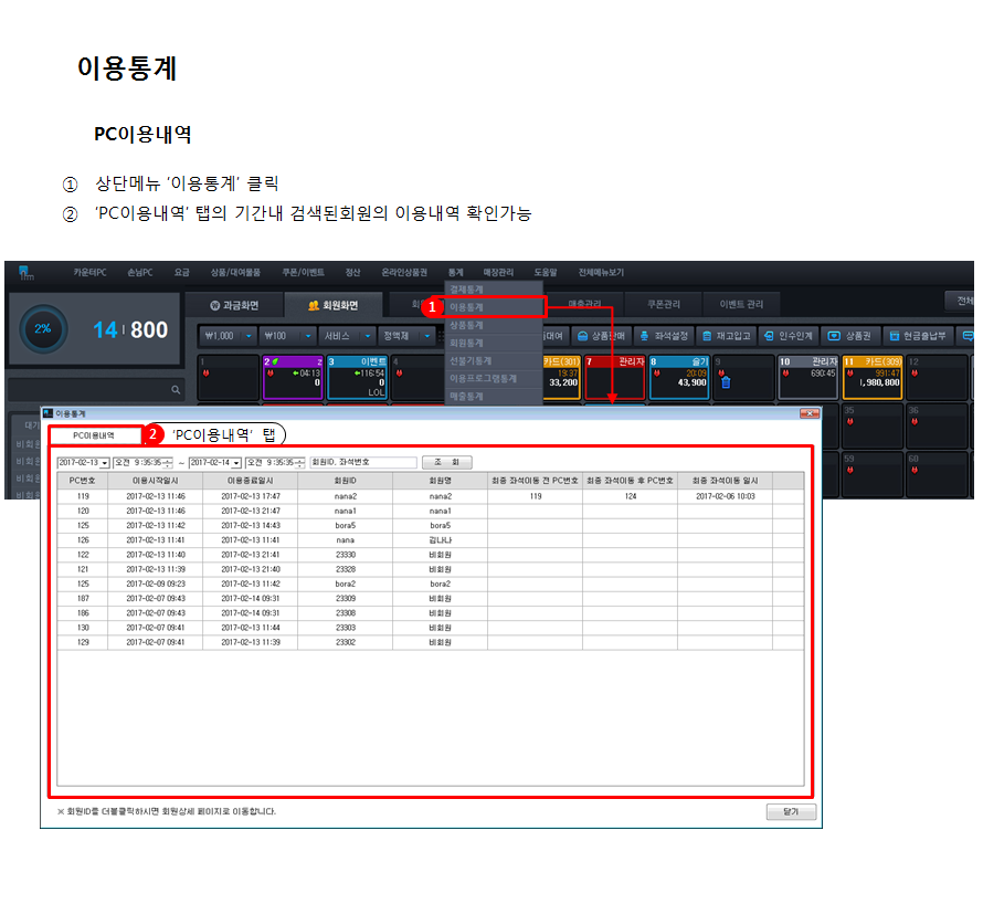 [조이머신PRO] '통계 > 이용통계 > PC이용내역'에 대하여 알아보겠습니다.